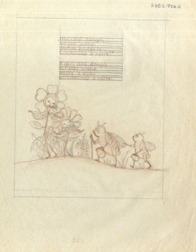 This piece is a fine example of harmonizing the work of the poet and that of the graphic designer. Erzsi Gazdag specifically asked her publisher to employ Kató Lukáts as the illustrator of her works. Our collection holds all illustration designs for this volume. Along with the images, the artist was also responsible for the complete graphic design, from the fonts and layout to the title page and cover. This drawing exemplifies her elegant style, which is always a perfect match for the text.