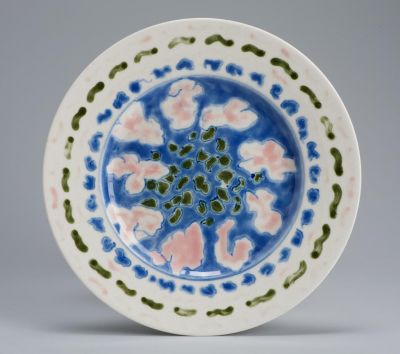 The surface of the round plate is straight, flat the slightly splaying rim is plain. The rim lets the whiteness of the original material appear under the pattern of the blue shapeless patches and the pink-green-pink rows of tiny waves. The surface shows abstract flower heads in a circle, against a spotted blue base, enclosing tiny, loose, green leaf-like patches. The shape of the plate was designed as a part of the dish set No. 431, in 1877. The pattern is not listed in any of the Zsolnay factory Décor books.