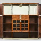 While Ede Toroczkai Wigand’s early designs were influenced by French Art Nouveau, and his individual ‘plank style’ seems to have been informed by the achievements of contemporary design in England and Scotland, some of his objects drew inspiration from the forms of the Viennese Secession. This latter is exemplified by the dining room set he presented at the 1902 Christmas exhibition of the National Society of Applied Arts (see IM Adattár, FLT 4848). The armchairs of the set are clearly a variation on the bent wood armchairs Otto Wagner designed for the Austrian Postal Savings Bank in Vienna, while the cabinet also reflects the influence of the Viennese Secession. A cuboid with rounded edges, this relatively low cabinet rests on a base covered with a silver-plated band of brass. There is an open shelf in the centre of the lower part, above which there are two doors with glass panels, followed by two drawers. There is a door on each side, attached to the carcass with hinges, and decorated, at the height of the lower drawer, with a row of ‘peonies,’ composed of circular inlays of silver, rosewood and cedar. The upper section of the cabinet has two doors in the centre, each with four glass panels, and two solid doors on the sides, which, like their counterparts below, wrap around the corners and are attached to the carcass with hinges. While the simple form and the use of expensive materials—rosewood veneer, silver inlay, silver-plated fittings—reflect the influence of Viennese design, in formal terms the cabinet is not unlike the simpler furniture Wigand Toroczkai made from cheaper materials (studio cabinets, secretaires, sideboards, cupboards). The original set also included a square table, with legs whose bottom was also covered with silver-plated brass, and a pyramidal longcase clock.
