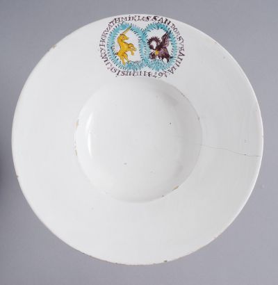 A deep bowl with a broad, slanted rim. The rim is painted with two adjoining wreaths, painted in green against the white background. One of them encloses a rampant yellow unicorn the other shows a pelican feeding its chicks, painted in manganese. There is an inscription around the wreaths: NEMIZS ISKIIAZY IIORVATII MIKLOS SAN DOR SVSANNA: 1678: