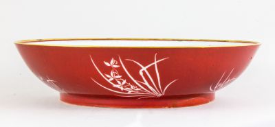 The bowl has the shape of a spherical segment it stands on a short, plain, rounded foot. It is deco-rated with the so-called Esterházy pattern, which origins from Chinese porcelain-making: a blossoming stem among a few grass leaves. The outside of the rim is painted in white against a red base, while the surface is decorated with red against white. The centre shows a smaller motif, surrounded with two rows of alternating small and large patterns. The other element of the Esterházy pattern, the two lines of vertical Chinese writing, is missing from this decoration (see Inv.No. 51.1374.2.1).