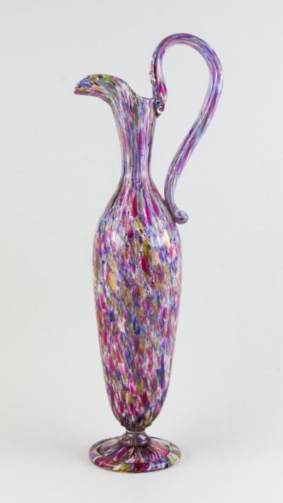 The object follows the form of the Greek oenochoe, the decoration, on the other hand, is based on the traditions of Venetian-Murano glass.