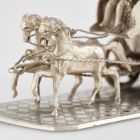 The carriage stands on a rectangular, plinth with lozenge-shaped decoration and cut corners. It is decorated with shell motifs, drawn by two galloping, repousse horses. There are two passengers sitting in the carriage, facing each other the driver sits in the driver's box, and a servant travels at the back, clasping the two suspended fringes.