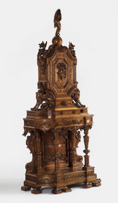 The bottom part is like a console, chiselled in a concave curve on the corners, with a drawer bulging out from the middle part. The middle is sup-ported by two baluster legs at the front and two engaged columns attached to the back. The back shows a coat of arms, with a winged herm on each side. A tiered plinth with three drawers rests on the table, holding a narrow cupboard with chiselled, concave corners. The door is decorated with two floating cupids holding a horn of plenty, in a richly jointed framework. At the bottom, two carved herms with dragon bodies hold the cup-board on the sides. The top of the cupboard shows a female figure floating above a globe, and a snake sphinx on each side. The cupboard is carved with string of pearls, garlands, ram and lion heads.