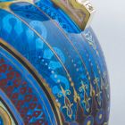 The flat, ball-shaped body stands on a broad foot and a fing node. The high neck ends in a top which is wide at the rim and bulging at the bottom. Both sides of the piece are equipped with a flat handle scrolling at the two ends. The handle has a rectangular profile it starts from the shoulder-line and joins the neck under the top rim. The foot is lined with black and Indian red stripes, rows of gilt spots, zigzag motifs and stripes. The body is decorated with a rosette-like ornament, constructed of semicircles, spot lines, motives of hispano- moresque ornaments in light lilac and gold. The field between the two rosettes is filled with wavy and lambrequin-like motifs, creating an oriental, geometrical decoration. Between the top rim and the bottom, the neck is covered with gilt trellis enriched with white enamel spots. The vase resembles - though with a modified shape and proportions - to the fourteenth and fifteenth century Spanish-Moor Alhambra type.