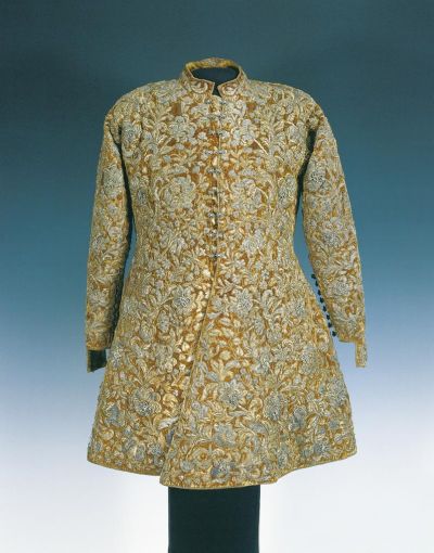 Straight cut, flaring below the waist. It is cut straight from the shoulder seams, has an upright collar and slits in the sides. The velvet is now brown, but earlier descriptions mention it as flesh- coloured or brick-red. The whole surface is covered with a network of harmonically ordered foliage, lilies and small flowers. The raised work is on a linen base the laid metal wires are stitched down in a geometrical pattern. The plasticity is stressed by the alternating use of gold and silver threads of different thickness, and by the contour of the twisted gilt wire. On the spine of the leaves and petals is bouillon embroidery. On the flowers are roses embroidered with grey pearls. The patterns of the front and the back are similar and symmetrical. It is trimmed with woven wire. The lining is light green silk cloth, with a flower pattern brocaded with metal wire. On the front are nine pairs of buttons with diamonds: a large diamond surrounded by three smaller ones. The slit of the sleeve fastens with eight golden buttons forming heraldic lilies. The description in the 1725 Fraknó inventory of the Esterházy treasury is as follows: "A flesh-coloured velvet dolman, with gold and silver thread, and embroidered with pearls, set with diamonds with 14 pairs of buttons." (Inventarium Thesauri Fraknensis Anno 1725. Almarium Sub Nris 79et 80. Nro. 11. — Inventory of the Museum of Applied Arts 236 / 1957.).