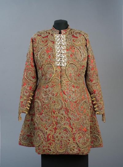 The dolman was a typical waistcoat of the Hungarian male costume worn right over the shirt and under the mente, but it could be worn without the mente, too. The once cherry-red, now red satin is completely covered with a strongly raised lace pattern of large baroque tendrils, flowers and leaves embroidered in metal thread. The oblique “shako” cut of the coat in front disrupts the accurately elaborate symmetry of the peculiar decoration. The hooks on the chest consist of white hands holding half-hearts, with whole hearts at the other end on which white doves with gold wings are sitting. When hooked up, the two half hearts unite and the beaks of the doves touch. The “flapped” sleeves reaching over the hand are also fastened with similar but simpler pairs of hooks. On the basis of the dolman colour and the symbols of the hook motifs a mid-19th century inventory defined it as the wedding dolman of Palatine Miklós Esterházy (1583–1645) worn at his wedding with Orsolya Dersffy (1580–1619) in 1612 or with Krisztina Nyary (1604–1641) in 1624. This is, however, contradicted by the size, cut and ornamentation of the rest of the dolmans in the treasury, on the basis of which it can be dated to the second half of the 17th century. It is therefore more probable that it was worn by Pál Esterházy (1635–1713), Miklós Esterházy’s son born to his second wife, at his second wedding in 1682. The garment owes its exquisiteness to the lace pattern of metal thread covering the dolman surface and the finely elaborated hooks. It was restored by Mrs Sándor Borsi in 1962 and Katalin E. Nagy in 2006.