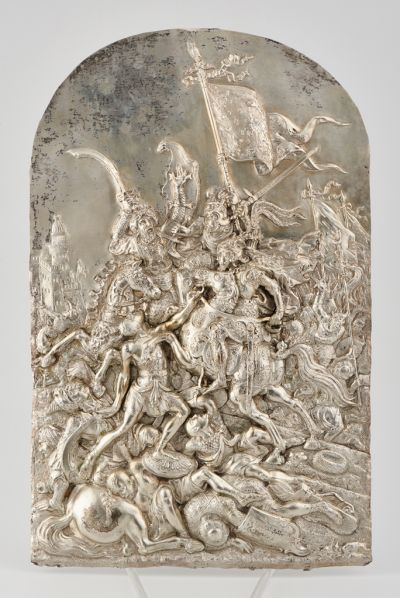 The hoof-shaped silver plate shows a lively war scene, depicting Frederick Barbarossa on horseback, in the centre, struggling with his enemies. There are dead soldiers with horses at the bottom of the scene, with an inscription engraved on a shield beside them: BATALLA: DE: ICONIUM / FREDERICO. BARBAROIA / MCXC. The top side of the composition show another engraved inscription, on the sword of a warrior: FRIEDRICH I. The technical virtuosity of the highly chased scene is enhanced in an interesting way: the stirrup of the leader was soldered separately and then applied on the relief later. In the goldsmith's mark book of Elemér Kőszeghy, issued in 1936, the author attributed the relief to József Szentpéteri, made between 1855 and 1862 however, this hypothesis has been doubted recently. On the Szentpéteri exhibition organized in the Budapest Historical Museum in 1981, this object was not exhibited and was mentioned in the catalogue only as a piece of a doubted origin.