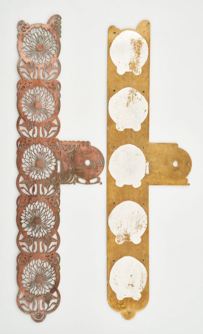 The long, rectangular, lined door fitting is pierced with five aster stems above each other. The bottom panel is silvered at the place of the blossoms. There is a keyhole on the right, rounded off protruding part, and a hole for the door knob. The door fittings by Theodore Lambert were purchased by the Budapest Museum of Applied Arts at the 1900 Paris International Exhibition, together with an armchair (Inv.No. 5923) and a shelf (Inv.No. 5404). The latter has a pierced decoration similar to those on the panels. The series was already exhibited at the 1899 Paris Salon.