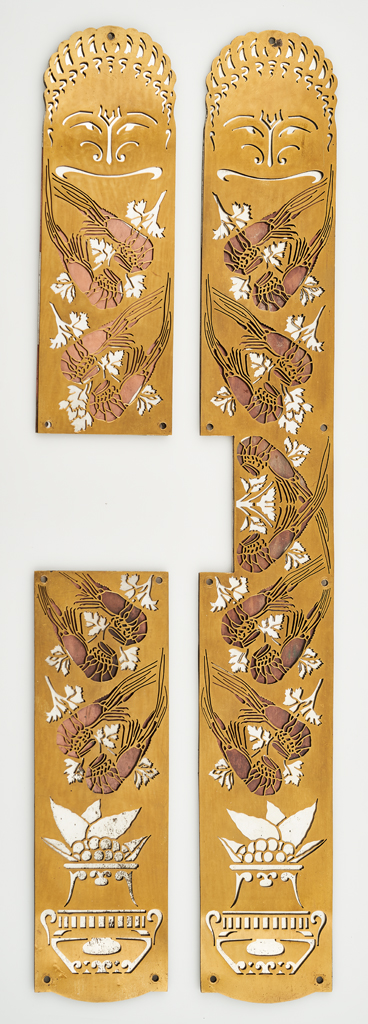 This set of three pieces (a pair of door panels, one consisting of two parts) used to have a lock and a door knob. The long, rectangular panels are pierced with the same motifs: a pot with plants at the bottom, surmounted by parsley-like stems, with tiny shrimp pairs in between. The curved top imitates a stylized, grotesque human face. The door fittings by Theodore Lambert were purchased by the Budapest Museum of Applied Arts at the 1900 Paris International Exhibition, together with an armchair (Inv.No. 5923) and a shelf (Inv.No. 5404). The latter has a pierced decoration similar to those on the panels. The series was already exhibited at the 1899 Paris Salon.