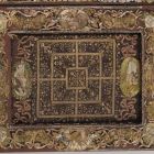 The textile cover and exquisite embroidery of this artwork in the Museum of Applied Arts is a rarity, as these game boards are usually made of peculiar woods, ivory or precious metal. No piece of similar age and technique has so far been published in foreign or Hungarian collections. On the outer sides of the folding board draughts or chess and nine-men’s morris, on the inside backgammon can be played. On the chess-board side in the narrow upper and lower strips the picture of an eagle swooping down on a fish and grabbing it with its claws can be seen in an oval laurel wreath frame. On the border of the board Turkish war trophies are shown in medallions, and in the corners there are verse lines in laurel wreaths. On the side of the nine-men’s morris the midpoints of the sides of the frame are marked by Turkish war trophies in oval medallions. The inner side shows the two halves of the backgammon board. The broad band separating the two fields is adorned with an eagle feeding its young and an eagle fighting a bird in laurel wreaths. In the corners crossing horns of plenty, in the middle the nine muses in oval fields can be seen.