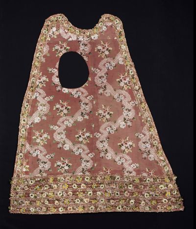 For the statues of the Virgin to be dressed gowns of different colours were made, according to the liturgy. This gown, trapezoid shaped and covering the body, has a round opening for the arm holding the infant Jesus. The textile is cherry-red. The ornamentation is a lace pattern waving lengthwise on the textile, which was fashionable in the 18th century. The pattern is bordered by green leaves and white flowers with a little blue in the middle. In the curves of it are naturalistic red roses. It is trimmed with a type of chenille work in one circling row, and in five rows on the lower part. On the border are relief-like coloured flowers on a white, light and reddish brown, and a light and dark-green reticular base. The textile of the infant Jesus' gown is similar, having the same form with set-in sleeves trimmed with a row of chenille around.