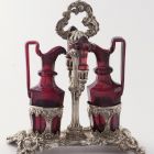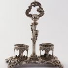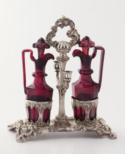 The rectangular plinth stands on four, outwardly bent feet, decorated with rich Neo-Baroque ornaments, running up and continued on the plinth. The two, octagonal stands with pierced sides are placed on the plinth. In the middle, there is an octagonal stem of jointed ribs, enriched with flowery-leafy patterns at the middle and at the top. An arm joins the middle-line of the stem from both sides, holding a pierced socket for the stoppers of the cruets. The three-lobed handle of repousse leaves and shoots is fixed with a knob, jointed and ribbed at the top. Two identical cruets for vinegar and oil belong to the set both are octagonal, splaying, with a ring at the neck, a beaked spout, and a rising, rectangular handle joining the side.