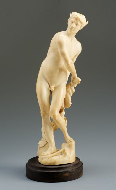 The statue of the naked male figure is in contraposto, with his right hand on the hilt of his sword. It is a motif characteristic of the baroque representations of the theme "The Decollation of Argus". Considering this and on the basis of the attributes (the winged head-piece, the pair of wings at the ankles of the figure), we may assume that the theme of the representation is not Perseus and Medusa, but Mercury. In the collection of the Esterhazy treasury the work is first mentioned in the inventory of 1693: "Statua Eburnea Mercury". (OL The Archives of the Ducal Line of the Esterhazy Family. Rep. 8. Fasc. C. No. 37. p. 39).
