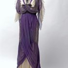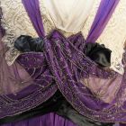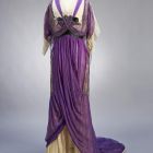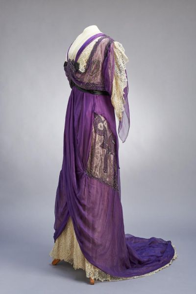 The fashionable high-waisted dress made around 1905 shown here has a cream colored undergarment covered by a softly-draping purple georgette, accentuating the shape of the feminine body. Embroidery on the belt reads that it was made at the Trieste shop of the Viennese Maison Sitich clothing salon. The two front sides fold over one anther asymmetrically, while the skirt section has a train in the back. It is decorated with machine-made lace and frills, and is embroidered with clear glass beads.