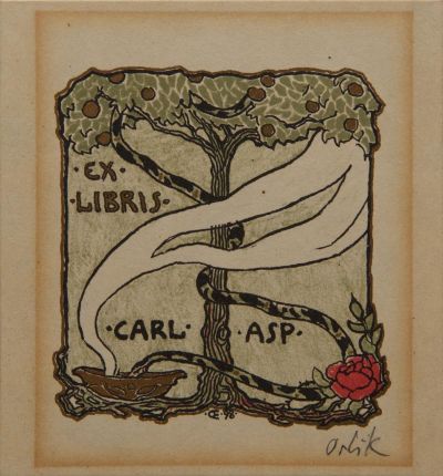 The simple, decorative ex libris, pieces of Orlik usually show well-known symbols, such as the one made for Carl Asp, depicting the tree of Knowledge with the serpent.