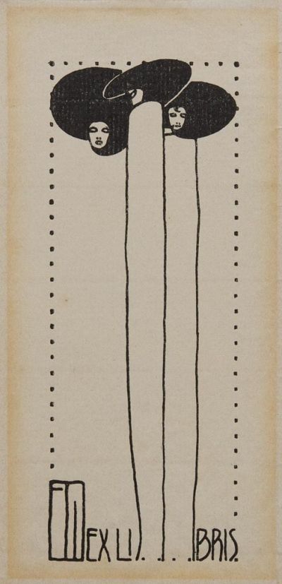 This ex libris, prepared for the Ver Sacrum in 1903 recalls the typical shapes of the Viennese architect - several similar drawings by Hoffmann had been published by the periodical, all characterised by the dominant motif of the «Gothic» line figure. On this ex libris, the inscription fits in the puncture ribbon frame and the long lines that end in stylized female heads. Hoffmann's art was greatly influenced by the Glasgow school, especially by Mackintosh, who created the principle of the human figure as a linear ornament. This principle is apparent in these long figures. The stressed linear vertically and the punctured surface division fit well in Hoffmann's oeuvre. On the bases of the strange FW initials it is supposed that this ex libris was made for F. Waemdorfer, an important contemporary sponsor of arts.