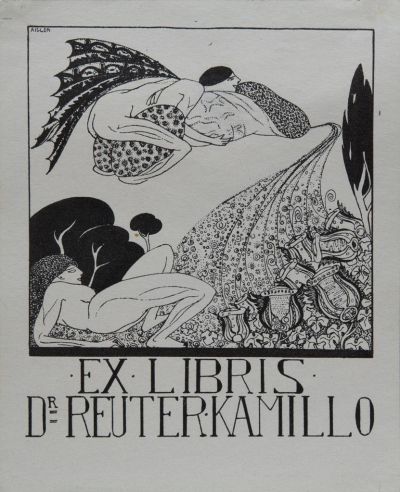 The erotic ex libris designed for Dr. Kamillo Reuter (1874-1954), a psychiatrist and university professor is a poetic description of physical love and fertilization: there is a naked, reclining female figure with her legs spread, above her there is a winged, flying male figure, with flowers springing from his seed. The ex libris is made unique with the daring, dynamic, linear drawing and the erotic ornaments, built mainly upon the tension of lines, motifs and patches. The artist approached the questions and the mystery of life in several of his pieces.