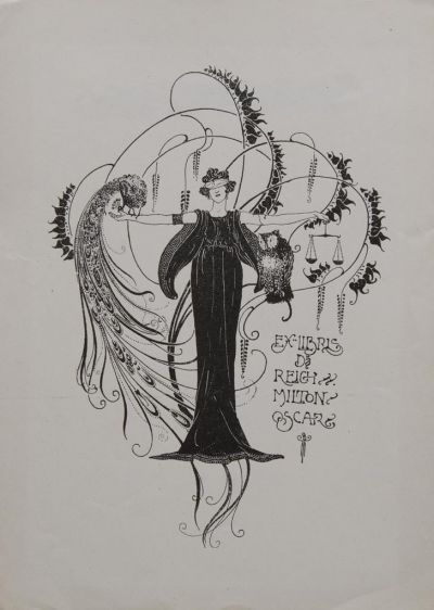 Oszkár Reich Milton was the secretary of the graphic department of the St. George's Guild, an enthusiastic collector of ex libris and a Ph.D. in Law by profession. This ex libris refers to his education, presenting a moral ex libris with allegories of measuring different quality things. In this case, the young artists depicted Justitia with folded eyes holding a pair of scales in her left. An owl sits on the delicate, stylized floral tendril of the background, while, instead of the usual sword, there is a decorative peacock on her right, a symbol of earthly vanity, the idea of blossoming life. It is a typical example of the refined lines and symbolic topic of Emil Sarkadi's ex libris pieces.