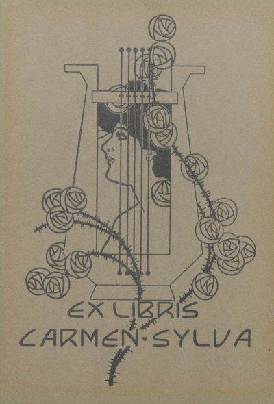 The main motifs of the ex libris made on the order of the Romanian queen - who was also a popular poet at that time - are a female head behind a lyre with roses. It was made with a unique technique, printed in silver over white chalk paper and silk.