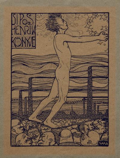 In the Henrik Sipos ex libris competition of the periodical A Ház (see the ex libris of Lajos Kozma), this piece received the second prize, symbolizing the fate of artists: a spiritualized, naked male figure walking on a rope hung above a crowd of mocking, everyday people at the height of factory chimneys. He is longing for the stars – “ad astra” - as an allegory of the lonely, difficult trouble-filled path of artistic vocation.