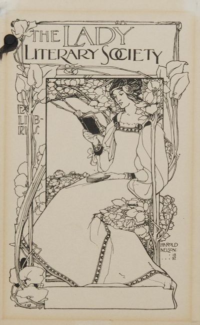 H.Nelson was first of all known as a book-illustrator, for his delicate, subtle, artistic pieces. Avoiding illusionistic effects, he uses a flat surface and mainly contours, and he apparently enjoys the playful lines that enframe the favourite motifs of the turn of the century: a female figure reading a book and flowers and leaves that can hardly be botanically identified. An earlier piece of similar topic and composition is also attributed to him. The ex libris described above was made for The Lady Literary Society, the topic of the reading lady itself suggesting the significant role women played in the cultural life of the turn of the century.