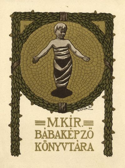 The bookplate he created for the Hungarian Royal Midwifery Training Institute is a coloured one. It shows a carefully swaddled infant inside a stylized wreath.