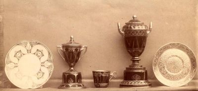 Exhibition photograph - porcelain vessels designed by Pál Horti, Christmas Exhibition of the Association of Applied Arts, 1901