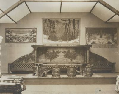 Exhibition photograph - Tapestries and seating furniture, Konstindustriutstallningen Exhibition at Stockholm, Sweden 1909