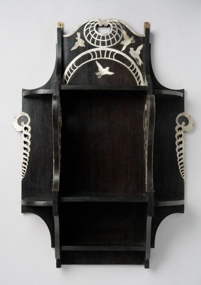 The three shelves, decorated with silver plates, are supported by two pierced consoles. Both the pierced parts and the curved top of the étagere are covered with silver plate, enriched with four flying bird motifs. This mountable shelf was made after the designs of architect Theodore Lambert, for the Paris International Exhibition.