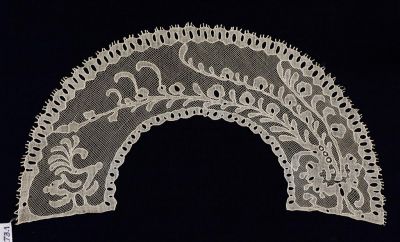 On a ground of tulle with a four-field grid pattern there is asymmetrical plant ornamentation: the pattern starts out from the left-hand corner and develops into three branches. In the right-hand corner there is a stylized leaf motif. The edges are embellished with a loop pattern. The border is loop-patterned picot.