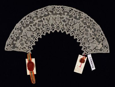 Inscription: | a bal alsó sarokba befűzött színes selyemszalagon vörös pecsétviasszal lepecsételt kartonlap „Fecit / Dékáni Árpád / 1909” felirattal; a pecséten ötágú korona alatt AD monogram; a jobb sarokban zsinóron függő, kilencágú korona alatt páros címeres pecsét kartonlapon, felirata: No 38. / Eventail / en point de / Halas/ exécuté en / Hongrie / tra- / vail á l'aiguille. |