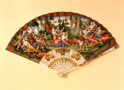 The vividly coloured leaf has a chinoiserie frame patterned in gold on a blue and red base. In three symmetrically positioned groups Roman soldiers and Sabine women struggle with each other. In the background on the left there is a building with a tympanum, in the centre an obelisk, and on the right Romulus giving the signal for the attack (Livy I, 9). With regard to composition, the depiction is based on a Pietro da Cortona painting (Pinacoteca Capitolana, Rome), and its direct model can—in all probability—be regarded as a copper engraving (Le Bl. 83 fig- 10/1.) by Pietro Aquila (|1692). The clumsy, awkwardly painted figures on the fan follow the original hardly at all, but their arrangement, as well as other collateral elements—details on buildings and military insignia —, follow it relatively faithfully. The lusty, well-built pro¬tagonists in the Corton picture become corpulent and stocky on the fan. The three groups—following the f ormat of the fan's leaf—are at a distance from one another, and are supplemented by a number of figures at the two edges. On the verso, among trees in the foreground, couple sit opposite each other in the background is a manor house, with a town at the top of a hill rising above it. The bottom sections of the distinctive, minutely worked sticks form circular, as well as trefoil and quatrefoil, apertures. In the top third, in three irregularly shaped, painted cartouches, one can see a vase of flowers and putti feeding lambs. On the mother-of-pearl inlay between the cartouches there are birds and caryatids(P). On the guard-sticks, above a caryatid growing out the painted tendrils, there is a figure playing the flute among the mother-of-pearl tendrils at the very top there is a mermaid. A fan with similarly embellished sticks made using an identical technique is published by Rosenberg 1891, VI, PI. 54 above right and by Kammerl 1989, No. 21 the latter describes it as English work.