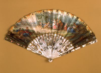 The painting on the fan follows the original picture only in the most perfunctory manner, utilising just two of its most characteristic motifs: the figure of Orlando falling on his knees before Angelica and the couple in the background dancing. The dignified pose of the two protagonists has become a charming one and the members of Angelica's entourage and the animated participants in the populous and mobile groups watching the event have been reduced to the number and type of figures usually found in fan pictures. On the reverse, on a small island, a young man with his sweetheart in his lap is writing their names on a monument surmounted by an urn: an / gelique / et / medor. From behind bushes and from among clouds Amor is spying on them, holding him quiver on high in triumph. The fan may have been a keepsake recalling a theatre performance, since Lully's works remained on the repertoire for longer than any before them. The references to love and marriage, however, rather suggest that the fan was an engagement present.