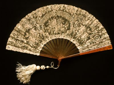 The leaf is framed by a row of flowers and leaves that is narrower at the bottom and on the sides but broader at the top. Within the frame there are three irregular fields made up of various—scallop, grill, star, and leaf—motifs, in each there is a bouquet of flowers. The most emphatic motif and element in the ornamentation is a repeated rose, hence this leaf belongs to one of the most popular types of Brussels lace: point de rose. The sticks are unembellished, and a white silk cord and tassel are attached to the handle. The collection's other, more finely executed, point de rose lace fan is MAA inv. no. 55.955 (Cat. No. 136).