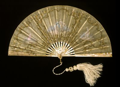 The leaf is divided into three fields by frame ornamentation consisting of Rococo scallop motifs highlighted by lines of spangles. In all three there are Rococo figures placed in an outline garden setting: in the middle field there is a young couple arm in arm, in the left-hand field there is a gentleman and in the right-hand field a lady. Around the fields there are small flowers. The sticks exhibit the same small flower ornamentation. The upper ends of the guard-sticks are pierced.
