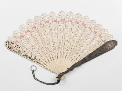 At the top the ivory-coloured sticks end in a pattern resembling ribbons crossing each other. When open the fan exhibits interconnected ornamentation filling its entire surface: pairs of doves kissing among lattice- patterned scallop motifs on either side of a wild rose branch. The same motifs are repeated on the guard- sticks. A silver chain and ring are attached to the handle. The ribbon links in the chain are pink. The careful working and the use of precious metal permit the conclusion that this piece is a relatively early one, dating from a time soon after the discovery of celluloid (1869).