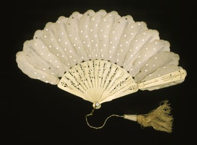 The white, lobular leafs are embellished with scattered circular steel spangles. The leaf and branch ornamentation of the sticks is enriched by steel inlay. A thin white silk cord and tassel are attached to the pressed handle. The adhesive remaining on the versos of the leaves indicates that-as was general with fans of this type and period-they were bordered with down. A similar piece in the collection is MAA inv. no. 80.723 (Cat. No. 116).