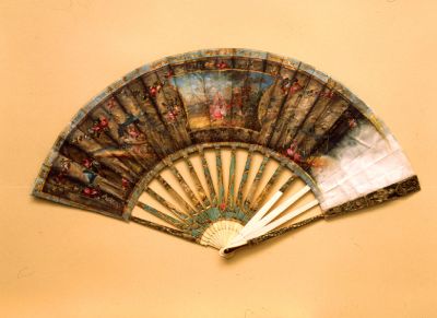 A narrow light-blue band adorned with festoons of golden flowers and leaves borders the leaf, which has a silver ground. In the middle of the leaf, in an anvil-shaped field, is a garden scene: a young man with his sweetheart dallying in his lap. On both sides of the field there are chinoiserie scenes in a landscape with palm trees. Around the depictions are garlands of roses. On the verso is a lonely island. On the turquoise sticks are a female figure holding a garland of flowers and a male figure holding a birdcage. On the upper part of each guard-stick a dancing (?) boy can be seen at the very bottom is tortoiseshell appliqué work.
