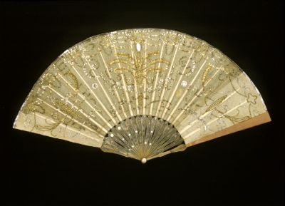 The pastel green leaf displays a symmetrical composition executed in small spangle-embroidery discs of two kinds—flat and convex. On the top the leaf is bordered by a row of quatrefoils and horizontal ovals in a narrow band. In the middle, a bouquet of flowers pouring forth in a fountain-like way is flanked by two classical-type embellishments. On the sticks there are stars and festoons of leaves.