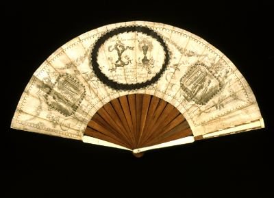Three spangle-framed medallions divide up the leaf. The middle medallion is oval shaped, while those on either side are octagonal. In the middle one is an allegorical depiction: intertwined monsters with snake's heads biting the French fleur-de-lys, while their tails are smashing the royal insignia to pieces. Beside them, on the top of the Fan, an urn rising above rose branches, shines a royal crown. The inscription on the depiction is as follows: Vier ge / heim verbogne Silhouetten/von ausserordentlicher / Aehnlichkeit / des unglücklichen Königs und der Königen v. Frankreich / nebst dem König und der Königin von / England = Four secretly hidden silhouettes of extraordinary likeness of the unfortunate king and queen of France together with the king and queen of England. In each of the two engravings on either side stands a young couple in front of a tempietto. At the top of the building in the left one is the inscription TREUE = Fidelity on the base is bleib / uns / günstig = Favour us always. At the top of the building in the medallion to the right is the inscription VERNUGEN = Beauty, and on the base weich / nie von / uns = May we never part. On top of each side medallion sit two winged putti or children the three medallions are linked together by a festoon of flowers held in their hands. Between the medallions doves hold in their beaks inscribed sheets of paper (from left to right): Zartlich / -keit = Tenderness, Aufrich / tigkeit = Sincerity, Freude = Happiness, Bestan / dikeit = Steadfastness. The entire leaf is bordered by a simple lobular pattern. The sticks are unembellished. The same representation is to be seen on the contemporary print Simplicius Calender (fig. 72/1.). The meaning of the depiction is undiscovered.