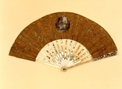 In the middle of the leaf, which was once probably red but which is now brown, is an engraving on a circular piece of paper: a young man and a child are listening to a lady playing a keyboard instrument. The source of the depiction is a scene from Johann Wolfgang von Goethe's The Sorrows of Young Werther. A possible original is a graphic work entitled Sorrows of Werter by Francesco Bartolozzi (1728—1815) published in London in 1785. The scene is bordered by a row of spangles. On the edges of the leaf is festoon ornamentation, and in the middle—on either side of the engraving—can be seen the letters A and M, in the midst of geometric ornamentation. The sticks are embellished with painted flowers and ribbons, and the guard-sticks with carved and painted flowers and ribbons. When the fan is closed it seems as though the sculpted ribbon on the guard-sticks is wound round the other sticks from top to bottom, binding them together. An identically constructed piece with similarly worked sticks is MAA inv. no. 57.876.