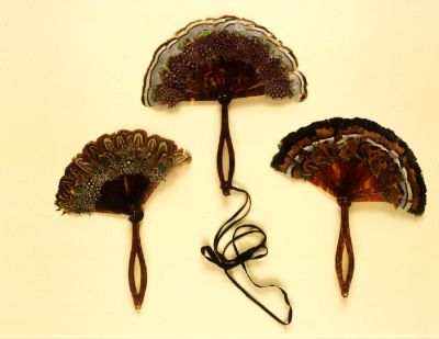 The fan, made from cropped, coloured feathers, exhibits a purple-spotted and then grey-brown-white-brown striped pattern (colours listed from bottom to top). Additional similar fans, although with different coloration, are MAA inv. nos. 59.834 and 59-991 (Cat. Nos. 178, 180).