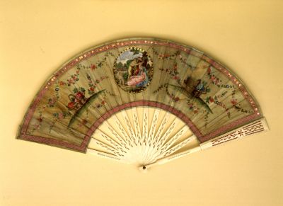 The uncoloured leaf is framed in pink. In the middle is an oval-shaped engraving. This shows a woman bound to a tree being freed by her female companions at Amor's command. On either side, between festoons, stands an enormous basket of fruit itself embellished with festoons. On the sticks there is a leaf and festoon pattern.