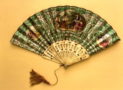 Three irregular medallions break up the green and silver leaf, which has rich, embossed, Neo-baroque ornamentation. In each of these medallions an idyllic scene is portrayed. In the middle scene young men are putting a wreath on a goat in the left one a young man is placing a cloak over the shoulders of his sweetheart, while in the right scene two ladies are playing with a little girl. On the verso the male member of a couple out walking chooses a flower from a girl's basket. Among the leaf and festoon embellishments on the sticks are almond-shaped leaves. A pink silk cord and tassel are attached to the handle. There is a fan with identical sticks in the collection at Hamburg's Altonaer Museum (Cat. No. 1974, No. 31, fig. 21).