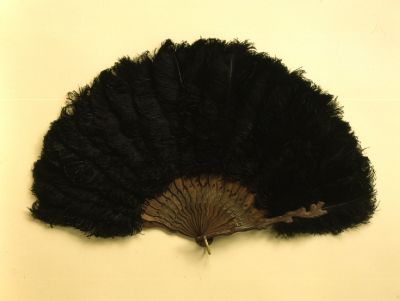 The black feathers are mounted on S-shaped sticks ornamented with a leaf pattern, and on guard-sticks shaped like trimmed tree branches.