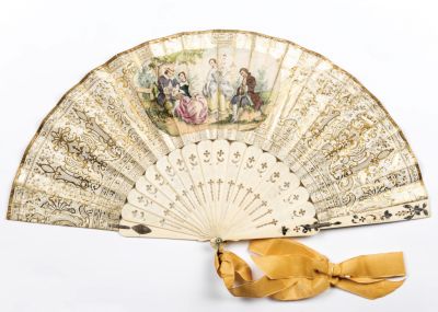 Cartouches are formed by Late Baroque ornamentation on a white and pastel-lilac background. In those to either side there is a pair of doves. In the large oval field in the middle there is a man receiving children next to him is a grieving female figure, and on either side ladies and gentlemen watch the scene. On the verso, amidst gilded ornamentation, a pastoral idyll with four protagonists can be observed. The sticks are adorned with leaves and flowers with four petals each. A repp silk ribbon of golden yellow is attached to the handle. The embellishment on the sticks is almost identical to that of MAA inv. no. 80.719 (Cat. No. 105).