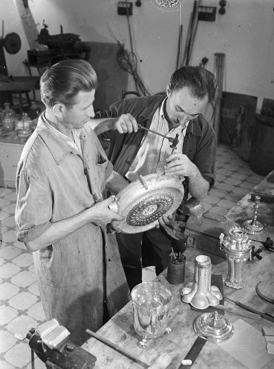 Photograph - László Dömötör and István Ungi restoring the so called Matthias pilgrim bottle from the Esterházy treasury in the Museum of Applied Arts
