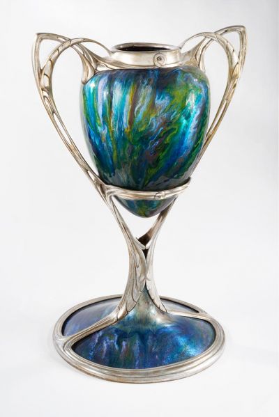 Little is known about the maker of this graceful and characteristically Art Nouveau vase, Jakab Rapoport. Even his date of birth and death are uncertain. His name was mentioned in various forms, and he first appeared at the 1898 Christmas exhibition with enamel objects of various techniques (cloisonne, painted and so-called cloud enamel). He also made designs from goldsmith works, but was most successful with his enamel pieces. At the 1900 World’s Fair he showed objects made according to designs by Sandor Nagy (1869–1950), Gyula Hary (1864–1946) and Odon Farago (1869–1935), among them enamel portraits painted in Limoges style. His international fame was due to his unique technique, the so-called cloud enamel, which resulted in a marbly surface suitable for covering even large surfaces. At the 1900 exhibition of the Viennese Sezession, he was mentioned among the exhibitors of the Parisian „La Maison Moderne” – one of the centres of the new style of applied arts. The mounting of this floor vase was designed by Georges de Feure (1868–1943). This Parisian artist and designer (his real name was Georges Joseph van Sluijters) was one of the outstanding and influential creators of the period and belonged to the gallery of Siegfried Bing (1838–1905), which was opened in 1895 as „La Maison de l’Art Nouveau” (the name became synonymous with the style of the Secession). The floor vase, along with several hundred other objects by Rapoport, received a gold medal at the 1902 Turin International Exhibition of Modern Decorative Arts. The vase was part of the decoration of the Budapest villa of Gyorgy Rath (1828–1905), first director of the Museum of Applied Arts in Varosliget alley, where it stood in the entrance hall.