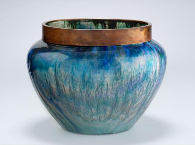The round foot supports a bulging flower pot. The narrow to rim is covered with a broad copper band. The surface is enamelled in bluish, violet, greenish shades. It is probably one of those pieces with which J. Rapoport won gold medal at the 1902 Turin International Applied Arts Exhibition. Together with the floor vase (Cat.No. 2.121), this flowerpot is likely tb have belonged to the furniture of György Ráth's former mansion at 10 Városliget alley. A pot of similar shape, supported by three ball feet can be recognized on illustrations of the large drawing room, on the table, in Radisics 1906 after p.40. (see Horváth 1992b p. 10 the same photo in Magyar Iparművészet Vbl.9, 1906, p.54.). The inventory of the Ráth György Museum mentions the enamelled Rapoport flower pot of the large drawing room, under No. 95 in the detailed list of item 848. If the exhibited flower pot is identical with the one mentioned in that inventory, it lacks the bottom part of the setting.